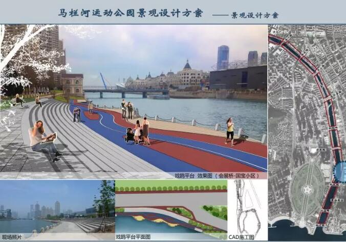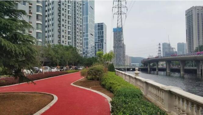 馬欄河運動公園以運動、休閑、親水為主題,以貫穿整個公園環(huán)形慢跑步道系統為基本骨架,在路徑周邊建設網球場、羽毛球場、乒乓球等活動區(qū)、健身休閑廣場及觀景平臺。跑步路徑的設計遵循“海綿城市”的理念,采用彩色透水混凝土路徑,實現雨水的有效蓄排。馬欄河沿線從西安路至國寶橋段還加固翻建了7處臨水觀景平臺,著力將打造一個滿足市民慢跑、健身、休閑、娛樂需求的沿河帶狀運動公園。