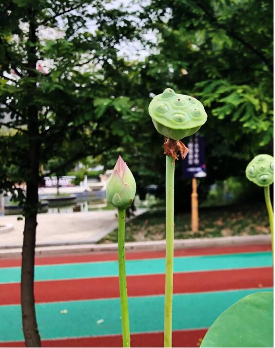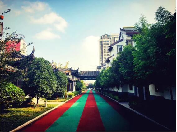 跑道呈橢圓形狀,南北長,東西短。跑道的外側(cè)是筆直的行道樹,東西兩側(cè)一律是排列整齊的水杉,南邊入口廣場外側(cè)是法國梧桐,內(nèi)側(cè)緊挨東西向跑道的是廣玉蘭,北面臨河。