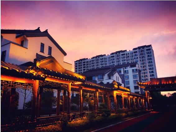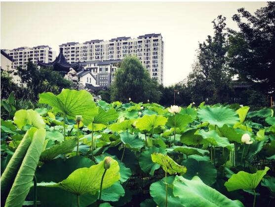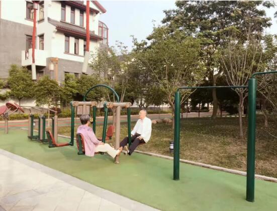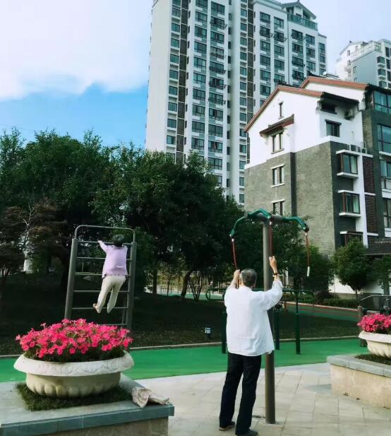 最南邊是一個小型的兒童露天樂園,幾個紅色、黃色、藍(lán)色的滑梯、迷宮、秋千,圍成一個小天地;兒童樂園的北面是一個泳池連著的飛檐峭壁的中式建筑,在建筑物的北面有一個小橋、流水、石板路散布其中的荷花池,荷花池的西側(cè)是用太湖石堆砌出的一座假山;再向北又是一個小水池和小廣場,小廣場上放置著一些單杠、雙杠及老年人用的健身器材。
