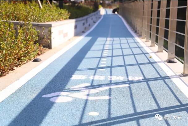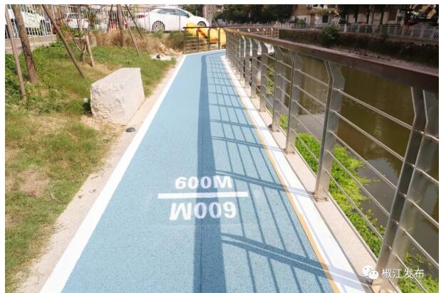 綠道路面用淡藍色的透水混泥土鋪成,并噴繪上簡易,時尚的圖案,18個石凳沿綠道而建。市民可以一邊信步在綠道上,一邊領略椒江的自然風光。