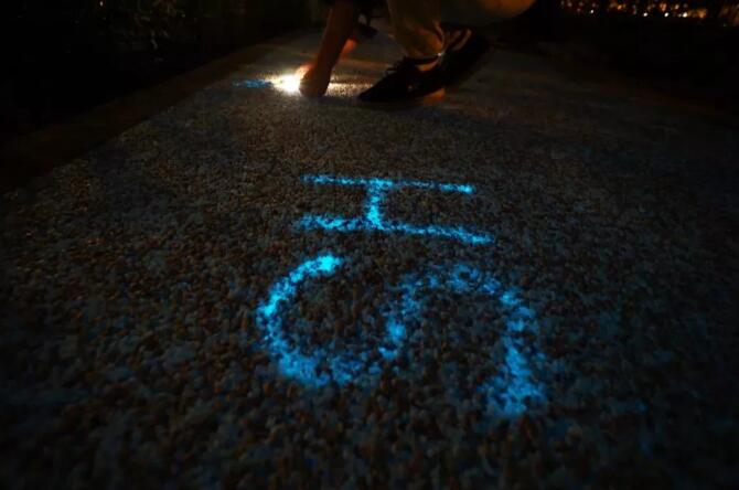 也有不少人選擇自己動手在發(fā)光步道上DIY一些有趣的文字和圖案~用手電筒或手機(jī)照明等光源當(dāng)“畫筆”,將發(fā)光路面作“畫布”,盡情釋放想象力吧!(PS:用手電筒照一兩分鐘即可,稍微一照就有效果~)