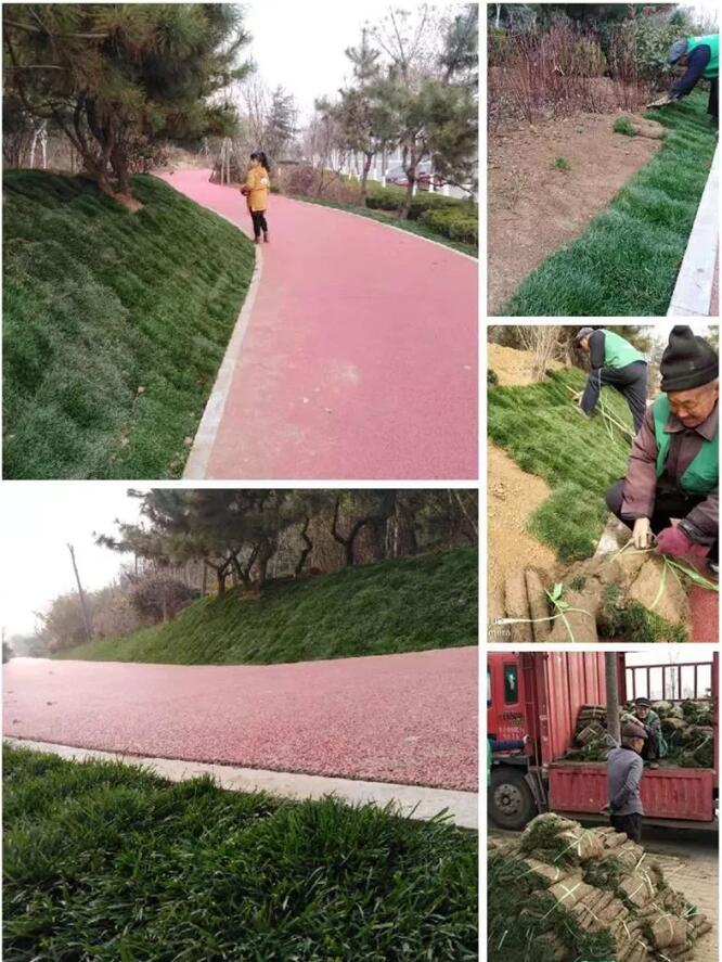 鋪設(shè)草坪,為防止坡度草坪傾滑,還采取了木楔固定措施。