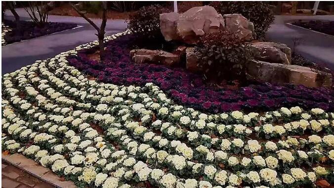 栽植羽衣甘藍(lán)等時(shí)令草花,點(diǎn)綴的五彩斑斕,引人入勝