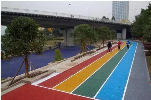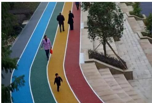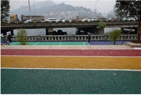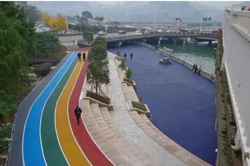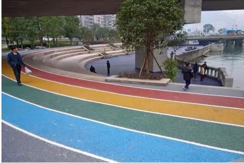 這處親水休閑空間又鋪上了彩色的塑膠跑道,