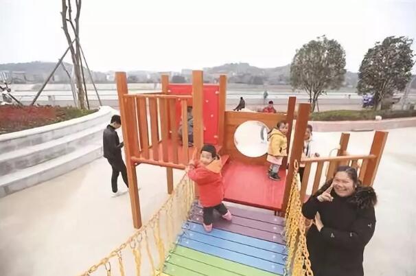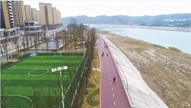 紅藍(lán)相間的停車(chē)場(chǎng)、沿江區(qū)劃明顯的紅色路面、旁邊剛鋪上草坪的足球場(chǎng)……正是陽(yáng)光明媚的時(shí)候,市民們來(lái)到新城綠道上,休閑愜意地談?wù)撝?jiǎn)陽(yáng)的變化。