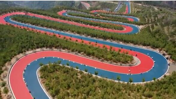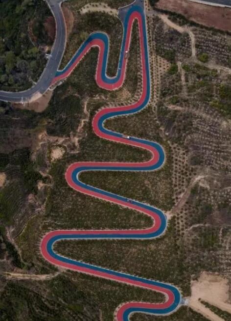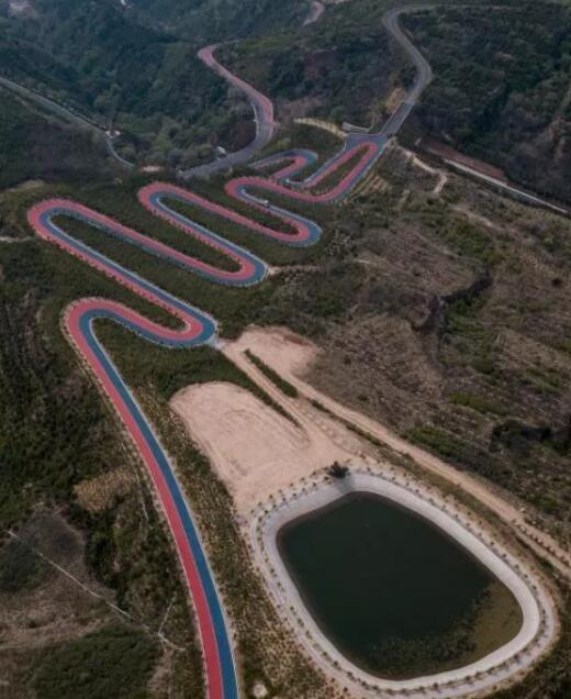 5月7日,山西省太原市,無人機航拍西山旅游公路一段彩色路面。這段公路鋪設了紅藍兩色瀝青,為當?shù)嘏e辦國際公路自行車賽專用賽道。從高空俯瞰,這段公路彎彎曲曲,色彩鮮艷,橫亙在高海拔山頂,被當?shù)孛癖姺Q為“云端上的彩虹公路”。