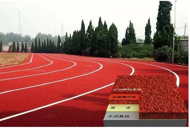該材料是雙層聚氨酯跑道系統(tǒng)?;A(chǔ)層為聚氨酯樹脂粘合混合的黑色環(huán)保橡膠顆粒,面層為EPDM橡膠顆粒與聚氨酯混合(表面無明顯顆粒狀),該材料具極佳的透氣疏水性能,故對地基要求不高,使用壽命為8年以上。