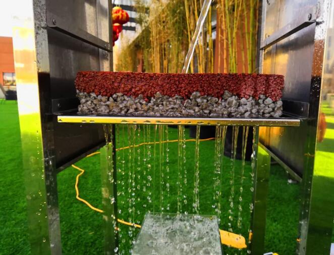 那么對(duì)于透水混凝土路面而言,雨水是依靠重力,通過透水混凝土層的不規(guī)則連續(xù)孔隙滲透,再進(jìn)入級(jí)配礫石層,再一次形成緩沖與分散,最終滲透到夯實(shí)的素土層中,整個(gè)過程安全可靠。下面的試驗(yàn)視頻,我們可以看到,從模擬的級(jí)配礫石層出來的水是分散的珠狀 這個(gè)道理,我們也可以簡(jiǎn)化聯(lián)想一下,有喜愛養(yǎng)花的朋友經(jīng)常會(huì)用到噴壺。