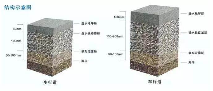 按照國家行業(yè)標(biāo)準(zhǔn)CJJT 135-2009《透水水泥混凝土路面技術(shù)規(guī)程》的要求,全透式人行道要由≥80mm透水混凝土層、≥150mm級(jí)配礫石層、夯實(shí)的素土基層組成;全透式其他道路要由≥150mm透水混凝土層、≥200mm穩(wěn)定碎石層、≥150mm級(jí)配礫石層、夯實(shí)素土基層組成。
