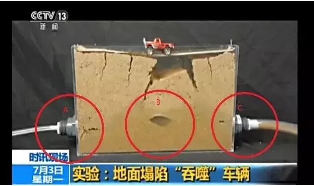 上圖即為央視報(bào)道的新聞截圖,造成地面坍塌的主要原因是由于A、C兩點(diǎn)之里的管線斷裂,從而使A點(diǎn)有壓力的水流沖入土層,另由于C點(diǎn)有開放出口,使部分水土從C點(diǎn)排出,進(jìn)而使B點(diǎn)形成一定的水流積存空間,最終導(dǎo)致下面下形成大范圍徑流水而使路面坍塌。