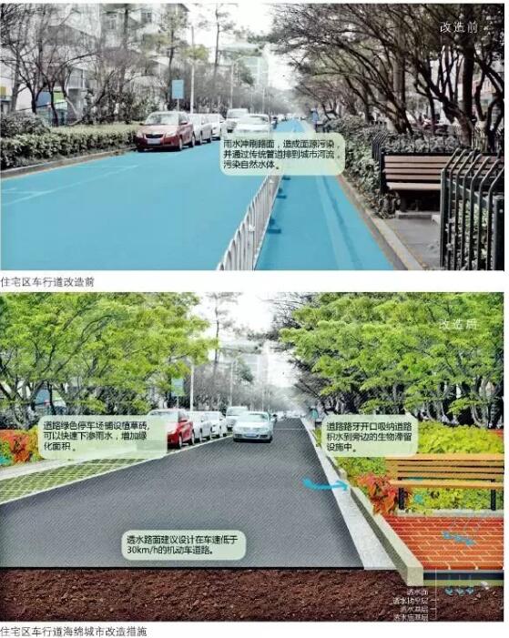傳統(tǒng)住宅區(qū)中的宅間道路和綠化帶可以改造成透水路面和生物滯留池,用來收集道路上的雨水,避免路面雨水沉積對居民生活造成影響。