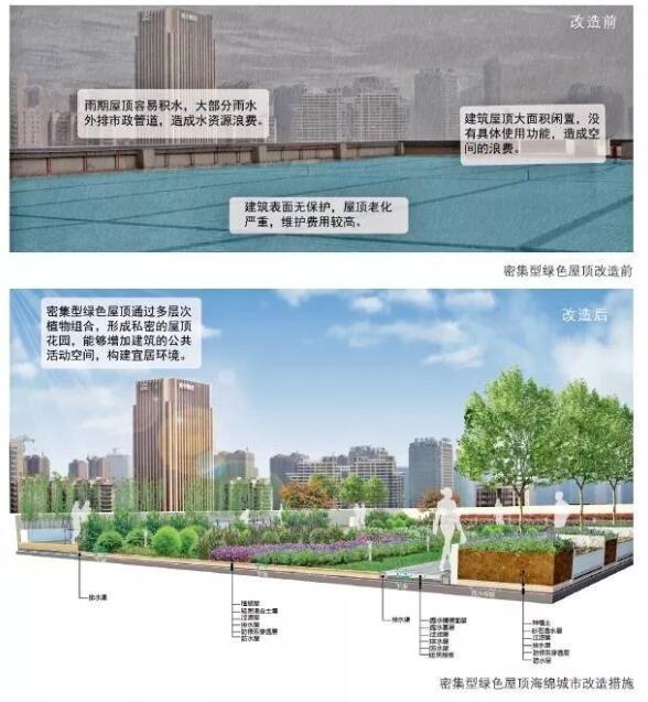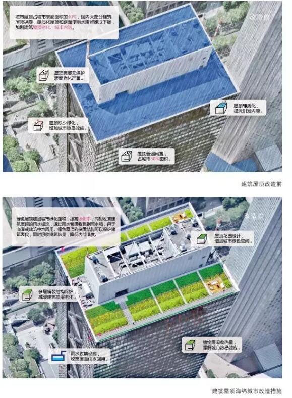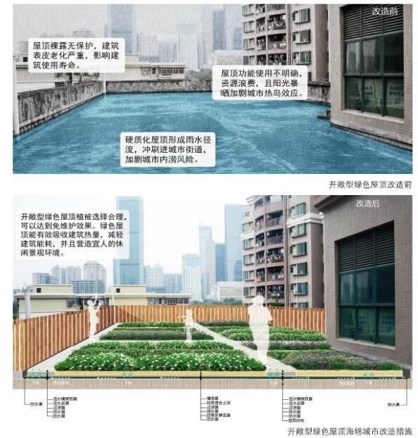 雨洪來臨時(shí),建筑屋頂產(chǎn)生的徑流是導(dǎo)致城市內(nèi)澇的重要原因之一。因此,將城市的建筑屋頂改造為綠色屋頂能有效緩解城市雨水徑流壓力。一方面,通過海綿城市結(jié)構(gòu)來收集、儲存雨水,并利用雨水進(jìn)行澆灌,可以節(jié)省各種能耗;另一方面,綠色屋頂將形成良好的城市景觀,提升城市的整體綠化率。