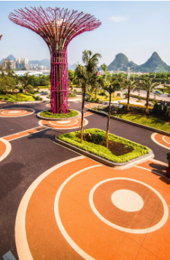 近年來(lái)透水鋪裝作為一種主流的鋪裝形式成為城市公共空間的重要組成部分。在進(jìn)行設(shè)計(jì)時(shí),顏色、圖案、功能等元素與不同尺度的空間、小品、建筑、植物等相結(jié)合,創(chuàng)造出豐富多樣的公共空間,為人們帶來(lái)不一樣的感受。尤其是色彩和圖案的表現(xiàn)與搭配是環(huán)境主要的造景要素,是心靈表現(xiàn)的一種手段,它能把風(fēng)景強(qiáng)烈地訴諸于情感,從而作用于人的心理。因此在透水混凝土鋪裝的設(shè)計(jì)過(guò)程中,色彩和圖案更應(yīng)該和植物、山水、建筑等統(tǒng)一起來(lái),進(jìn)行綜合設(shè)計(jì)。