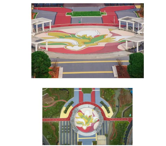 圓形鋪裝圖形完美柔潤(rùn),用時(shí)通過(guò)不同色彩的圓環(huán)鋪裝,給人以強(qiáng)烈的節(jié)奏感和韻律感。