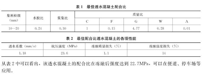 結(jié)合透水性、抗壓強(qiáng)度值及抗凍性能總體分析,為確定適合保定地區(qū)最低溫度的透水混凝土配 合比,選取最佳組合確定最佳配合比,并進(jìn)行各種性能測(cè)試(表1和表2)。