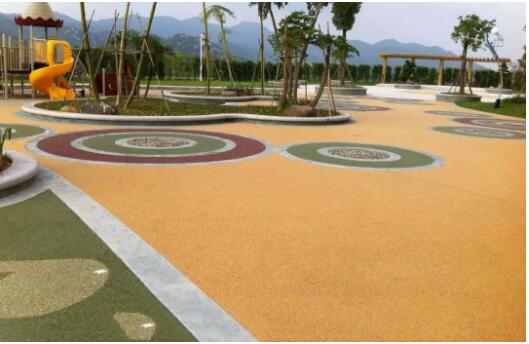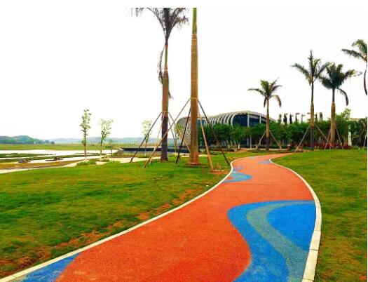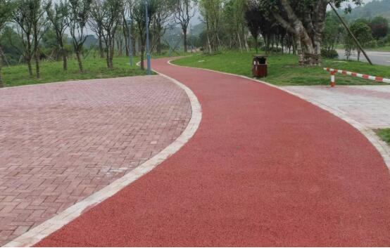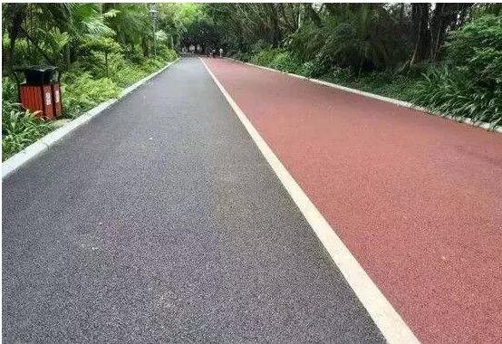 在旅游景區(qū)環(huán)境中,透水塑膠主要用于慢行騎車道或兒童活動場地,面層材料往往選用本具有良好透水性的EPDF顆粒,厚度10~15mm,基層采用粗料透水混凝土,厚度根據(jù)不同地區(qū)地質(zhì)條件而定。