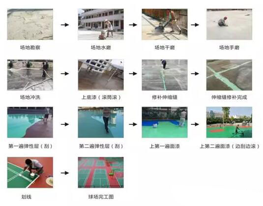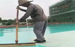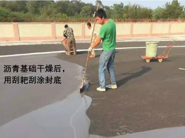 現(xiàn)場調(diào)料:丙烯酸乳液50KG,水泥兩包,80目石英砂3包,108膠水25公斤,加適量水,混合攪拌均勻,倒入施工現(xiàn)場,用刮耙將漿液均勻刮涂再場地地面(基礎(chǔ))上,需掛涂2-3遍,待其干固4小時,每一道施工完,干固后打磨平整,再用自來水試水平,積水處再配底涂混合料補(bǔ)平,直到符合積水率要求。
