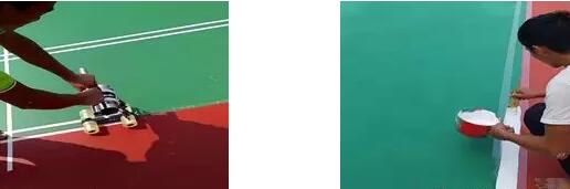 施工方式:按標(biāo)準(zhǔn)尺寸量度定位,標(biāo)出界線位置,用美紋紙沿界線兩邊貼在球場上,用專用劃線漆涂刷于美紋紙間,待表面干后撕掉美紋紙。分兩道涂刷。若球場表面為粗糙面,第一道可加20%面層專用砂涂刷,以防滲邊。