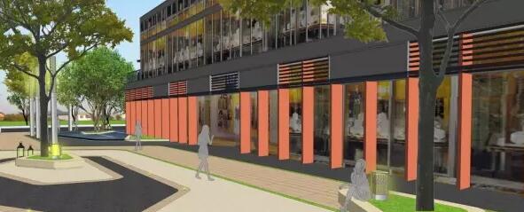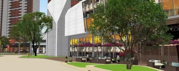 售樓部?jī)?nèi)側(cè)以透水混凝土為主的內(nèi)街街景效果圖——深灰色透水混凝土+米黃色透水混凝土+黃色石材鋪裝與建筑外立面色彩形成豐富的色彩界面