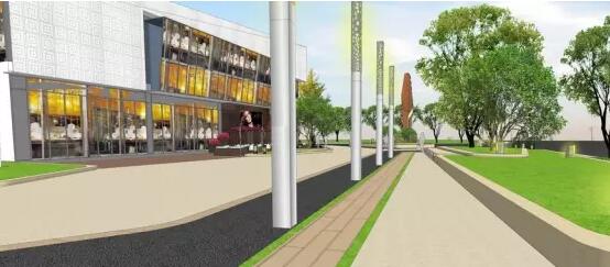 場(chǎng)地主入口效果圖,采用米色及深灰色透水混凝土鋪裝