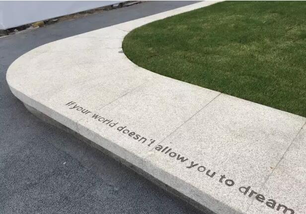 實(shí)景圖,黑色、米色透水混凝土色調(diào)對(duì)比強(qiáng)烈,引導(dǎo)性強(qiáng),草縫、鑲嵌文字等細(xì)節(jié)的呈現(xiàn),使場(chǎng)地更具品質(zhì)感