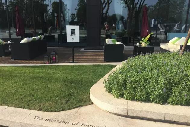 部外部實(shí)景圖——由近及遠(yuǎn)鋪裝材質(zhì)依次為木、石材、透水混凝土,層次分明,舒適的洽談空間加入室外軟裝布品后,形成精心、雅致的室外空間