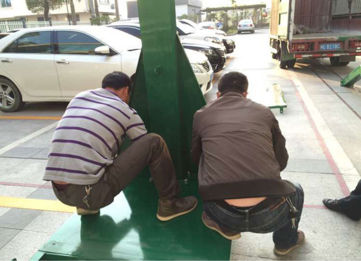 以箱體前端為支點(diǎn),從箱體后面把箱體抬起來,使他們向前傾斜,把伸臂裝在立柱上。