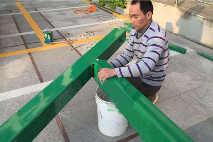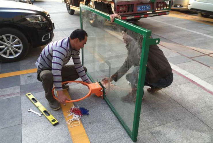 把籃筐與鋼化玻璃籃板固定,然后把籃板與伸臂鏈接固定