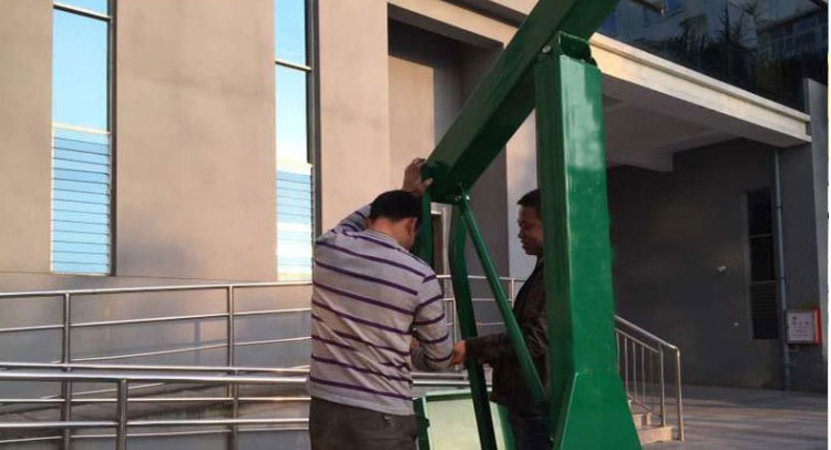 先把箱體放在距離籃球場(chǎng)邊線0.6米外,將立柱安裝在底箱上。
