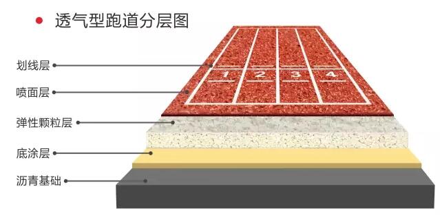 跨越體育 透氣型塑膠跑道采用國際田聯(lián)認可的復合結構,面層為PU顆?;駿PDM耐候性環(huán)保彩色顆粒,底層聚氨酯樹脂粘合的環(huán)保顆粒,符合國際比賽標準,標準厚度13mm。