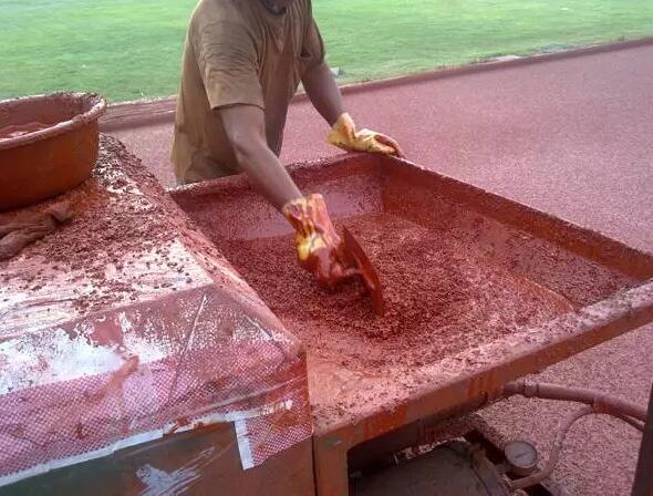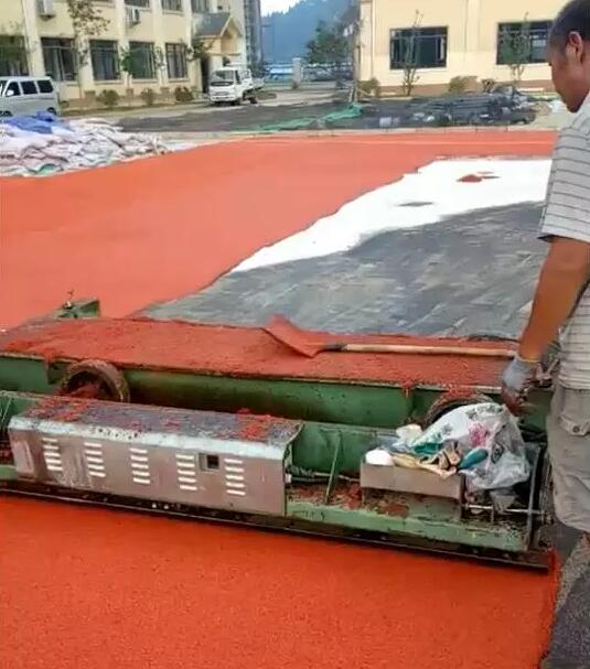 施工時應一邊刷膠水一邊鋪彩色顆粒層。當膠水固化后再鋪設彩色顆粒層會影響粘結,不宜大面積涂膠后,再鋪顆粒層,應做到刷膠水多少面積,應立即鋪多少面積的顆粒。