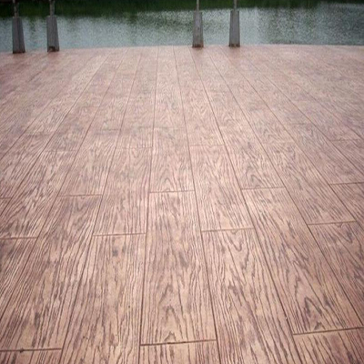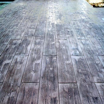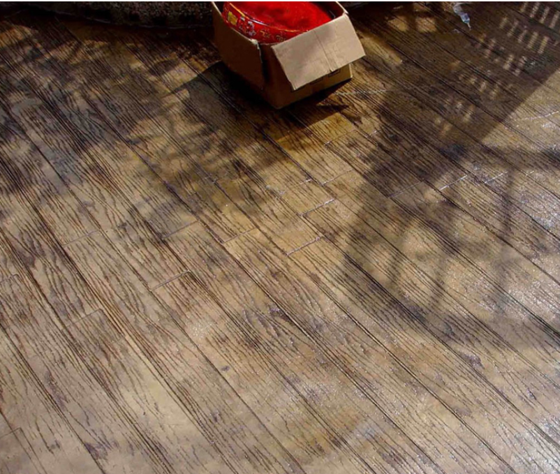 仿木壓模地坪是通過(guò)使用強(qiáng)化料和顏料經(jīng)過(guò)特殊工藝處理后,滲入普通混凝土中改變其性質(zhì)與顏色,再使用脫膜粉和模具在未干的混凝土面層上壓印紋理圖案,最后使用清洗表層、噴涂保護(hù)劑等工藝,在其表面上創(chuàng)造出仿真度極高的自然木質(zhì)效果。