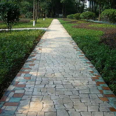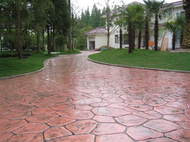 仿石壓模地坪是在新鋪裝的水泥混凝土的基面上找平后(未完全凝固前)使用模具壓印形成各種形狀的紋路,再經(jīng)過表面抹光與噴涂處理等施工工藝,使水泥混凝土表面形成仿真度極高的石材紋理和立體效果。如:大理石、花崗石、自然石等效果。仿石壓模主要材料:混凝土強(qiáng)化料,脫膜粉,保護(hù)劑,顏料等。